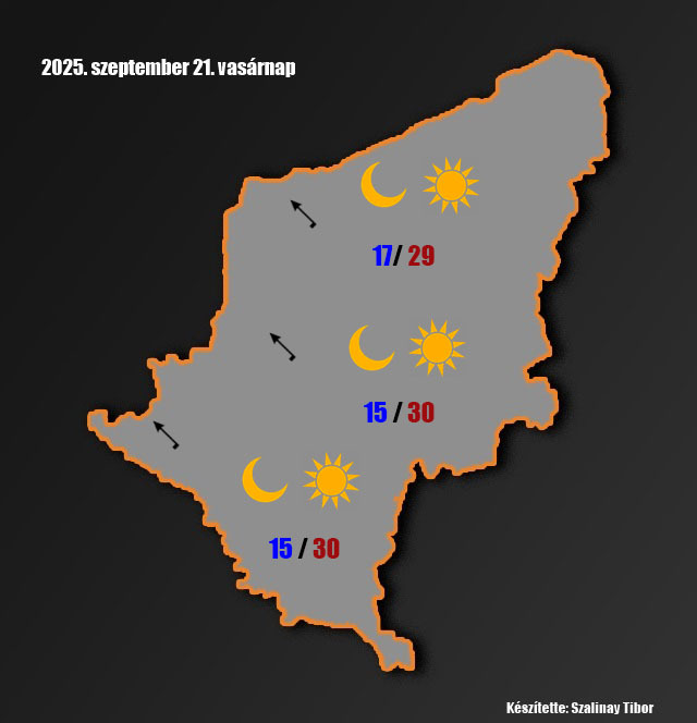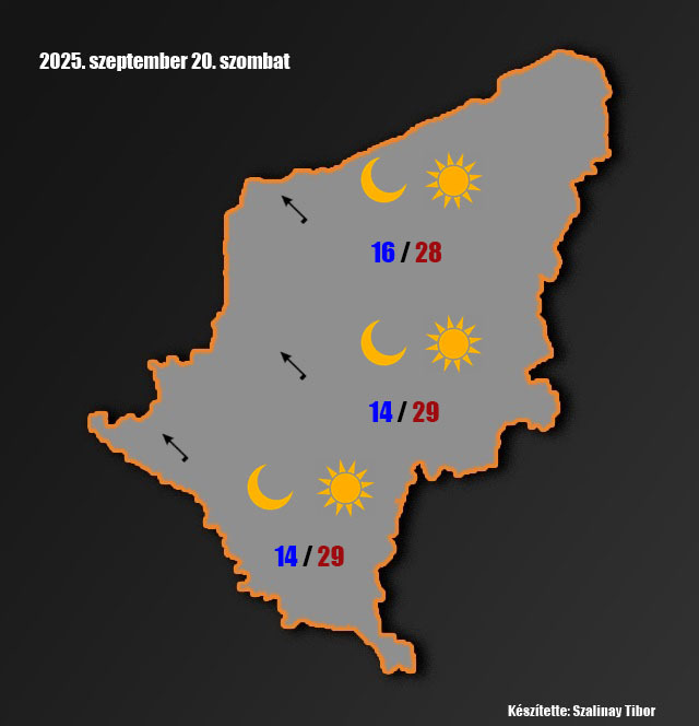 Szombat: túlnyomóan napos, száraz idő várható, a délkeleti szél kissé megélénkül. A hajnali órákra 13-16 fok közé hűl a levegő. A nappali hőmérsékletek 28-30 fok között alakulnak.