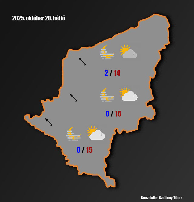 Szombat: a változóan, időnként erősen felhős ég mellett több-kevesebb napsütés is lehet. Az északnyugati szél megerősödik. A nappali hőmérsékletek 14-16 fok között alakulnak. Késő estére 7-9 fok közé hűl a levegő.