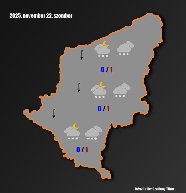Szombat: borult idő várható többfelé havazással, néhol havas esővel. Az északi szél megerősödik. A hajnali órákra 0 fokig hűl a levegő. A nappali hőmérsékletek 0,+2 fok között alakulnak.
