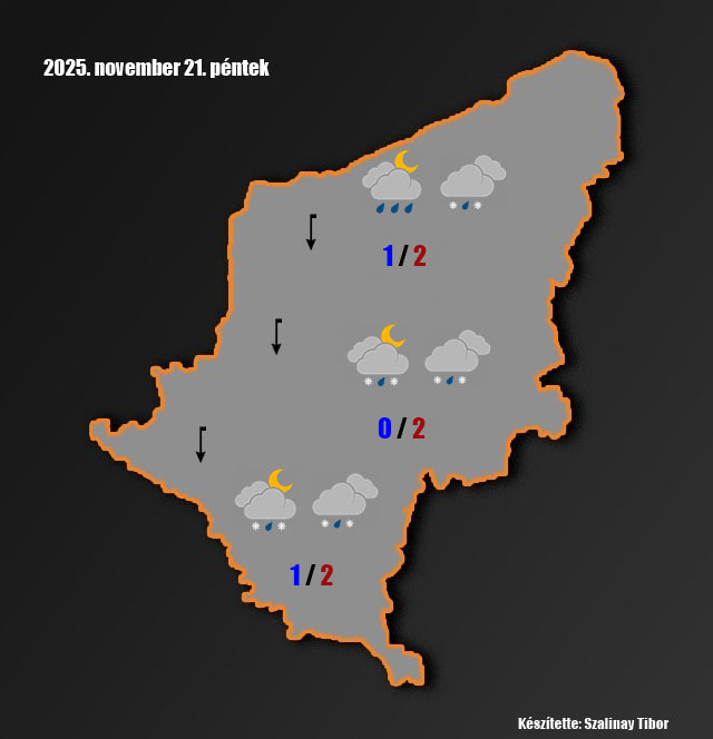 Péntek: túlnyomóan borult idő várható többfelé havas esővel, havazással. A csapadékhullásban azonban lehetnek szünetek. Az északi szél megerősödik. A nappali hőmérsékletek 1-3 fok között alakulnak. Késő estére 0,+2 fok közé hűl a levegő.