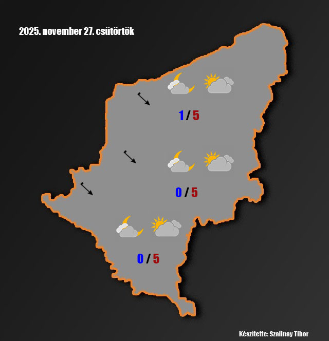 Péntek: többnyire felhős idő várható, de helyenként még előfordulhat kevés napsütés. Az északnyugati szél megélénkül. A hajnali órákra -2, 0 fok közé hűl a levegő. A nappali hőmérsékletek 3-5 fok között alakulnak.