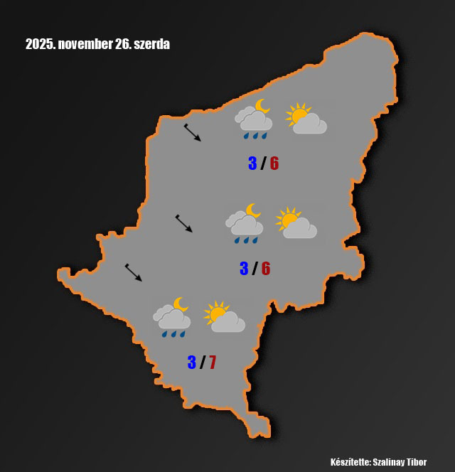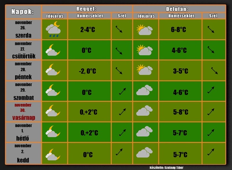 Szerda: eleinte még előfordulhat eső, zápor, majd napközben csökken a csapadékhajlam, elvékonyodik a felhőzet. Az északnyugati szél megerősödik. A délutáni órákra 6-8 fok közé melegszik a levegő. A késő esti hőmérsékletek 2-4 fok között alakulnak.