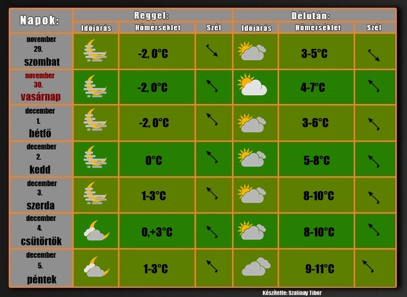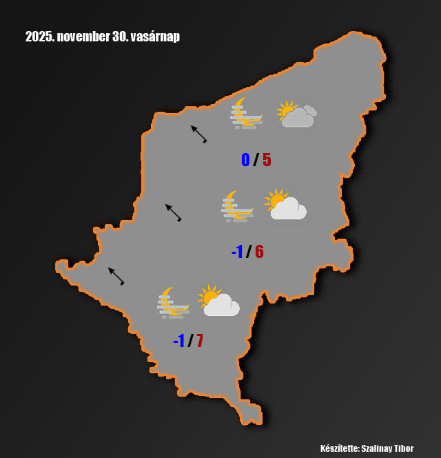 Vasárnap: változóan felhős, párás idő várható több-kevesebb napsütéssel, de helyenként tartósan felhős, ködös időszakok is lehetnek. A szél gyenge lesz. A hajnali órákra -2, 0 fok közé hűl a levegő. A nappali hőmérsékletek 4-8 fok között alakulnak, de a ködös helyeken ennél jóval hűvösebb lehet.