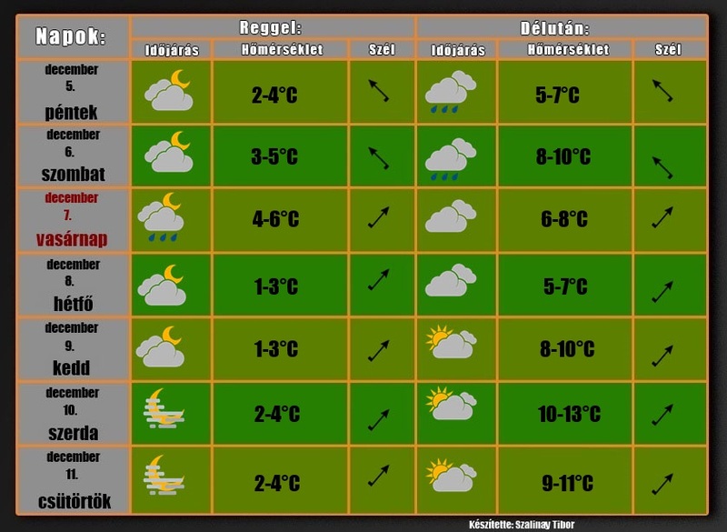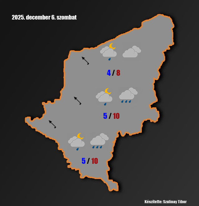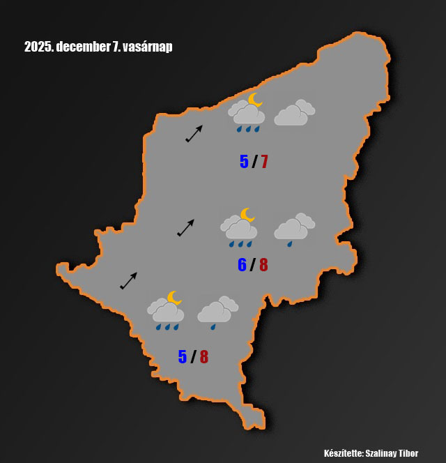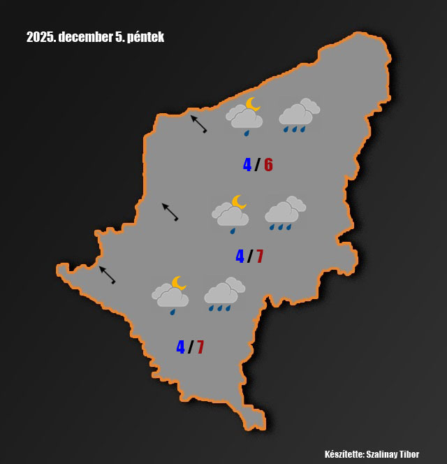 Péntek: borult idő várható többfelé esővel, záporral. A délkeleti szél megélénkül. A nappali hőmérsékletek 5-7 fok között alakulnak. Késő estére 3-5 fok közé hűl a levegő.