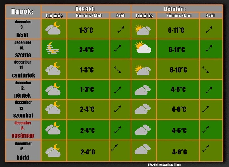 Kedd: többnyire felhős, néhol ködös idő várható, helyenként azonban előfordulhatnak átmeneti napos időszakok. A délnyugati szél megélénkül. A nappali hőmérsékletek 6-11 fok között alakulnak. A magasabb értékeket a gyengén felhős, napos tájakon mérhetjük. Késő estére 3-5 fok közé hűl a levegő.