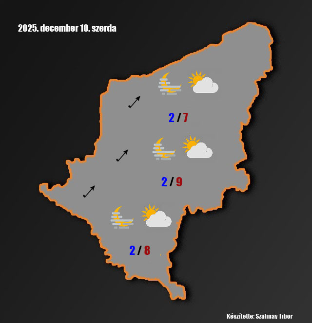 Szerda: felhős, ködös és napos tájak váltakoznak. A délnyugati szél megélénkül. A nappali hőmérsékletek 6-11 fok között alakulnak, a magasabb értékeket a gyengén felhős, napos tájakon mérhetjük. Késő estére 3-5 fok közé hűl a levegő.