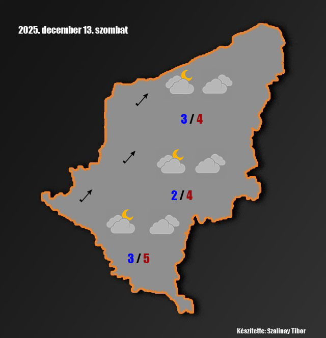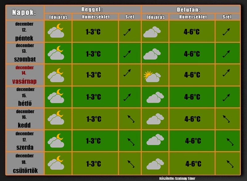Péntek: többnyire borongós, ködös idő várható, csak néhol süthet ki átmenetileg a nap. A délnyugati szél gyenge lesz. A nappali hőmérsékletek 4-6 fok között alakulnak. Késő estére 2-4 fok közé hűl a levegő.