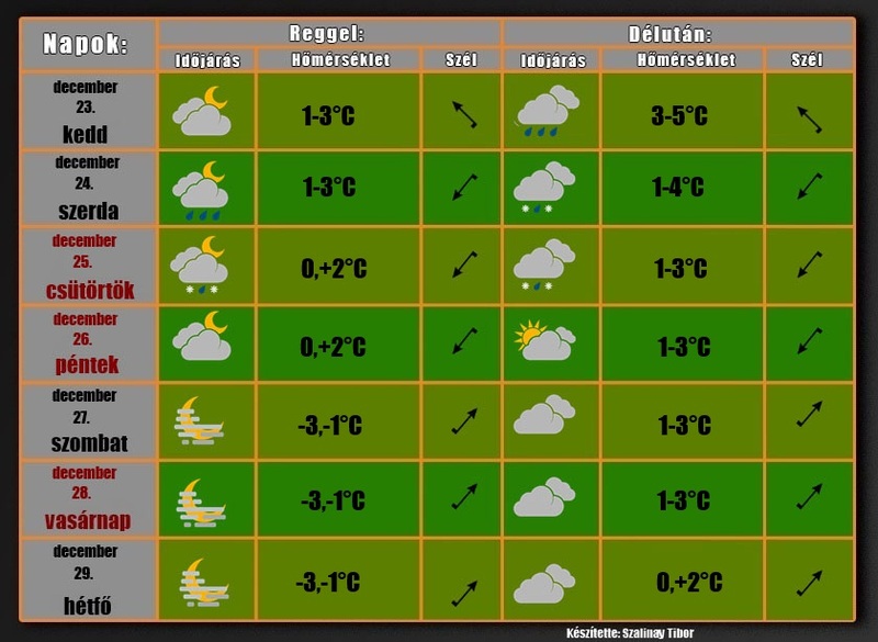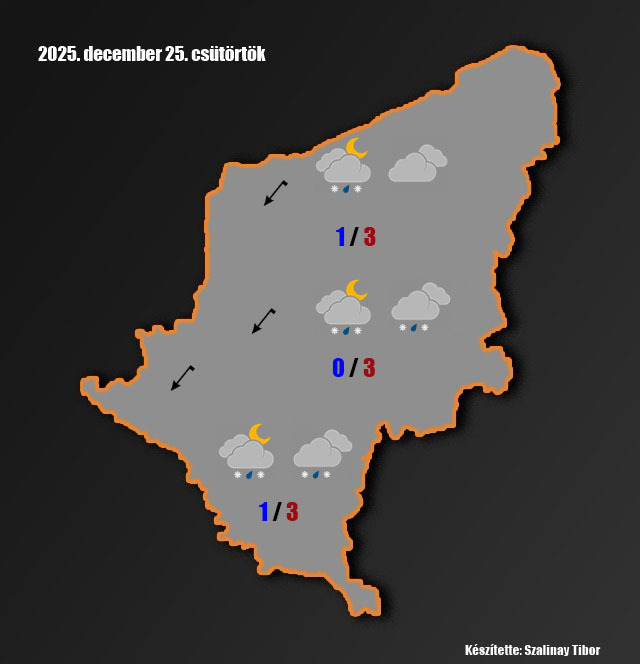 Csütörtök: többnyire borult idő várható, csak néhol vékonyodhat el a felhőzet. Szórványosan várható kisebb eső, havas eső, havazás. Az északkeleti szél megélénkül. A hajnali órákra 0,+2 fok közé hűl a levegő. A nappali hőmérsékletek 1-3 fok között alakulnak.