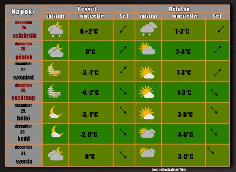 Péntek: napközben fokozatosan felszakadozik a felhőzet, kevés napsütés is lehet. A délnyugati szél megélénkül. A hajnali órákra 0,+2 fok közé hűl a levegő. A nappali hőmérsékletek 2-4 fok között alakulnak.
