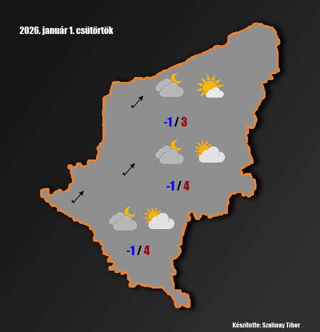 Csütörtök: felszakadozik a felhőzet, több-kevesebb napsütésre is számíthatunk. A délnyugatira forduló szél megélénkül. A hajnali órákra -2, 0 fok közé hűl a levegő. A nappali hőmérsékletek 2-4 fok között alakulnak.