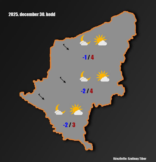 Kedd: változóan felhős, napos idő várható. Az északnyugati szél megerősödik. A nappali hőmérsékletek 2-4 fok között alakulnak. Késő estére -1,+1 fok közé hűl a levegő.