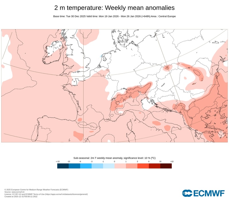 3. Ábra: az ECMWF modell hőmérsékleti anomália előrejelzése a január 19-26-ig terjedő időszakra.