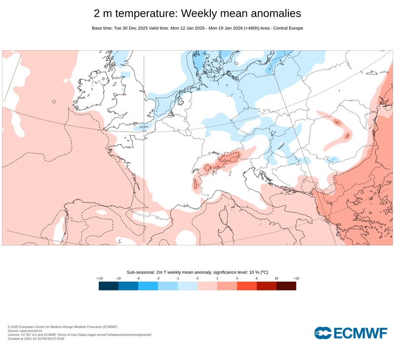 2. Ábra: az ECMWF modell hőmérsékleti anomália előrejelzése a január 12-19-ig terjedő időszakra.