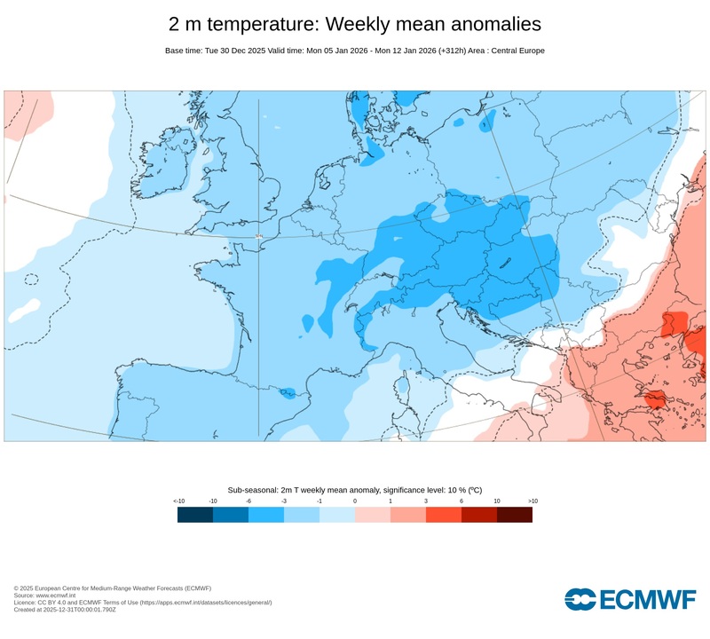 1. Ábra: az ECMWF modell hőmérsékleti anomália előrejelzése a január 5-12-ig terjedő időszakra.