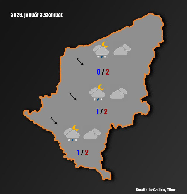 Szombat: többnyire erősen felhős vagy borult idő várható, csak néhol süthet ki a nap. Többfelé valószínű kisebb vegyes halmazállapotú csapadék. A változó irányú szél megélénkül. A hajnali órákra 0 fok közelébe hűl a levegő. A nappali hőmérsékletek 1-3 fok között alakulnak.