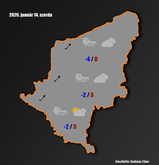 Szerda: többnyire borult, helyenként tartósan ködös idő várható, csak néhol süthet ki rövid időre a nap. A délnyugati szél kissé megélénkül. A hajnali órákra -4,-2 fok közé hűl a levegő, többfelé képződhet köd. A nappali hőmérsékletek -1,+3 fok között alakulnak, az alacsonyabb értékekeket a tartósan ködös tájakon mérhetjük.