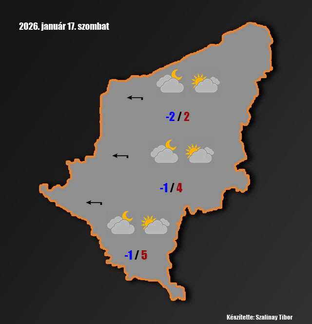 Szombat: többnyire felhős, helyenként tartósan ködös idő várható, a déli tájakon azonban előfordulhat kevés napsütés. A keleti szél megélénkül. A hajnali órákra -2, 0 fok közé hűl a levegő. A nappali hőmérsékletek még 2-5 fok között alakulnak.