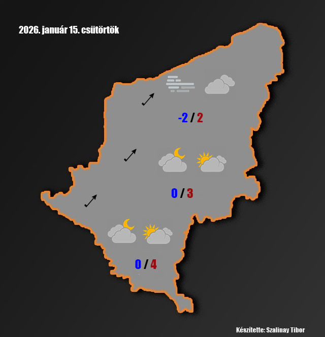Csütörtök: többnyire felhős, néhol tartósan ködös idő várható, helyenként azonban kevés napsütés is lehet. A délnyugati szél megélénkül. A nappali hőmérsékletek 1-4 fok között alakulnak, az alacsonyabb értékeket a ködös tájakon mérhetjük. Késő estére 0,+2 fok közé hűl a levegő.