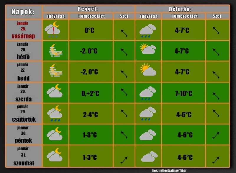 Hétfő: folytatódik a többnyire felhős, néhol ködös idő, néhol azonban rövid napos időszakok is lehetnek. A délkeleti szél megélénkül. A hajnali órákra -2, 0 fok közé hűl a levegő, többfelé képződhet köd. A nappali hőmérsékletek 4-7 fok között alakulnak.