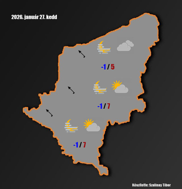 Kedd: változóan felhős idő várható több-kevesebb napsütéssel. A délkeleti szél kissé megélénkül. A hajnali órákra -2, 0 fok közé hűl a levegő, helyenként köd is képződhet. A nappali hőmérsékletek 4-7 fok között alakulnak.