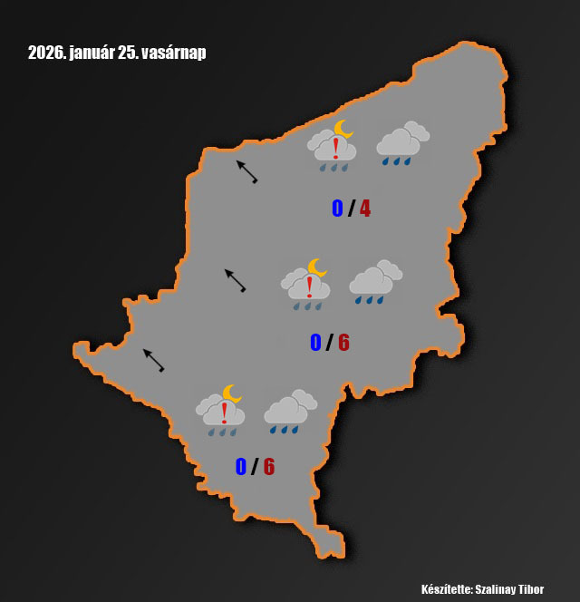 Vasárnap: többnyire borult idő várható és többfelé valószínű eső, zápor. A délkeleti szél megélénkül. A nappali hőmérsékletek 4-7 fok között alakulnak. Késő estére 0,+2 fok közé hűl a levegő.