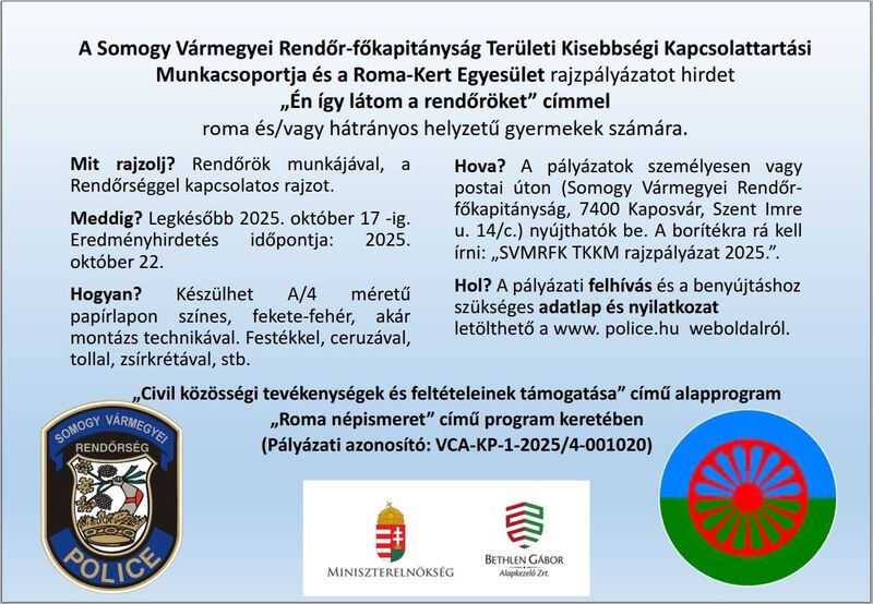 A Somogy Vármegyei Rendőr-főkapitányság Területi Kisebbségi Kapcsolattartási Munkacsoportja rajzpályázatot hirdet hátrányos helyzetű és/vagy roma származású gyermekek részére.